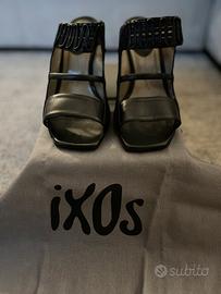 Sandalo in pelle nero, punta qudrata, con tacco rivestito in pelle, altezza 10 cm. Suola in cuoio e gomma. Marca IXOS, nuove, mai usate, numero 40. Contiene anche sacchetto in tessuto per trasporto.