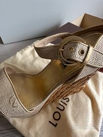 Sandalo Louis Vuitton taglia 37,5 color oro con cinturino alla caviglia e con tacco in corda misura 12 cm