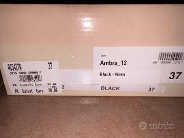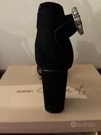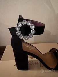 Sandalo aperto nero scamosciato numero 37 con chiusura alla caviglia con gioiello. Scarpe usate una volta.