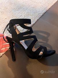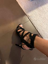 Vendo sandalo nero elegante con tacco alto (circa 10 cm), modello con fasce incrociate e chiusura con laccio alla caviglia.