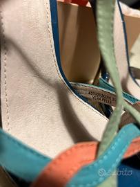 Sandalo in pelle e tessuto indossato pochissimo praticamente nuovo. Taglia 39. Tacco 14 cm plateau 4cm.