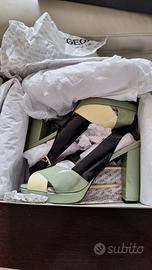 Vendo elegante e moderno Sandalo in pelle da donna, taglia 38. Fibbie intrecciate con colori nero, panna e verde. Tacco 10 cm. Modello "New Egizia" della Geox. Utilizzata in un paio di occasioni, in stato pressochè perfetto. Vendo per scarso utilizzo. Visibile per prova in Sangano (TO) previo accordo, preferibilmente non spedisco, ma se acquistato a distanza vale la formula del "visto e piaciuto" e perciò non accetto successivi resi. Per ogni informazione, contattate ANGELA.