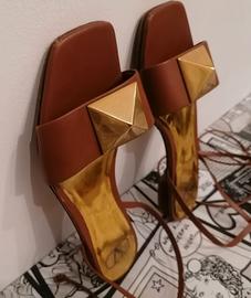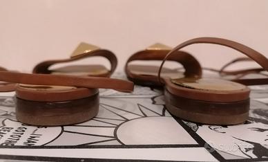 Sandalo Rockstud Gladiator colore marrone. Valentino Garavani. Made in Italy. Tg. EUR 37. Caratterizzato da maxi borchia dorata sul davanti, soletta in pelle dorata con stampa V logo, allacciatura alla schiava sul polpaccio e suola in cuoio. 100% Pelle.