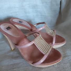 Bellissimo sandalo per donna in legno color rosa con camoscio sul plantare e fibbia con strass, tacco cm.11, usati pochissimo. Molto particolari ed eleganti