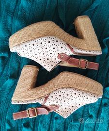 Bellissimo sabot di Shellys London in pelle scamosciata intagliato a laser con plateau e tacco rivestiti in corda intrecciata e cinghia regolabile, misura 41, vestibilità regolare. Questo sandalo spuntato è stato utilizzato pochissimo e solo all' interno