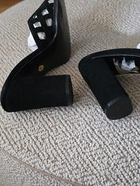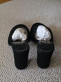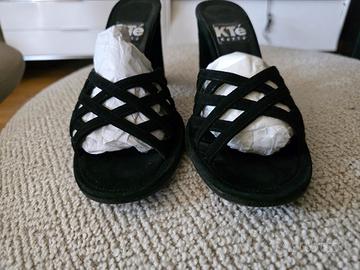 Sandalo nero in camoscio, aperto davanti e dietro, tacco comodo cm 9. Elegante ma anche carino con i jeans perchè particolare nel suo genere. Utilizzati 1 volta per poche ore. Taglia 35.