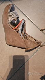 sandalo con zeppa color bisccotto in pelle scamosciata.Lacci bicolor tinta salmone e biscotto. Zeppa cm 12 Platform cm 3. Usate 2 volte