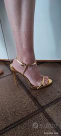 Splendidi sandali a punta aperta in un vibrante colore oro metallizzato, perfetti per sfilate, concorsi di bellezza o eventi eleganti. La calzatura è un esempio di eccellenza artigianale, realizzata interamente in Italia. Materiale di pregio: Suola in Vero Cuoio, sinonimo di qualità e durata. Stile: Tacco a stiletto alto e sottile, senza plateau, per una linea della gamba estremamente slanciata ed elegante. Sicurezza: Cinturino alla caviglia regolabile che garantisce stabilità durante la camminata o il catwalk. Colore: Effetto metallizzato molto luminoso, ideale per catturare i riflettori in passerella. Taglia: 40. Condizioni: Seminuovi. Usati solo per qualche sfilata , presentano lievi e normali segni di usura sulla suola in cuoio, ma la tomaia e i tacchi sono in ottime condizioni,