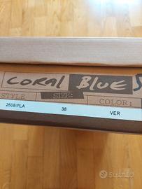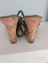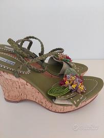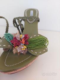 Meraviglioso sandalo verde n.38 in camoscio e pelle con decorazione floreale in paillettes tacco in sughero allaccio intrecciato alla caviglia nuovo in confezione. Coral blue.