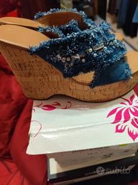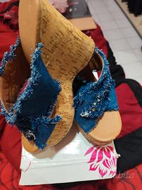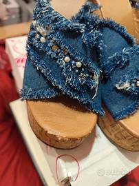 Bellissimi sandali con zeppa, alti ma comodi, in jeans e sughero num 39. comodi e versatili
