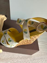 Sandalo Luois Vuitton con zeppa in corda cm.12 ; cinturino alla caviglia in tessuto con piccole foglie dipinte ; misura 37,5