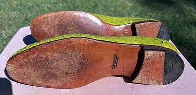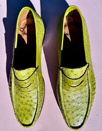Rarita’ : mocassini di Santoni (fatto a mano) in pelle di struzzo color verde penicillina. Taglia 41 e 1/2 . Vestibilita’ pianta del piede: stretta. Usate 4 volte.