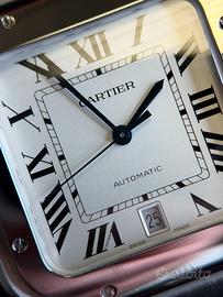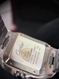 Orologio Santos, modello grande, movimento meccanico a carica automatica, calibro 1847 MC. Cassa in acciaio, corona ettagonale ornata di uno spinello sintetico sfaccettato, quadrante opalino argentato, lancette a forma di gladio d’acciaio azzurrato, vetro zaffiro. Bracciale in acciaio con sistema di regolazione della misura SmartLink. Secondo cinturino in pelle di vitello, fibbia pieghevole intercambiabile in acciaio. Entrambi sono dotati del sistema d’intercambiabilità QuickSwitch. Larghezza della cassa 39,8 mm, spessore 9,38 mm. Impermeabile fino a 100 metri.
