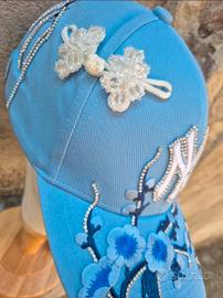 Cappello baseball (base modello NY) azzurro cielo, trasformato in un pezzo unico d'arte artigianale.