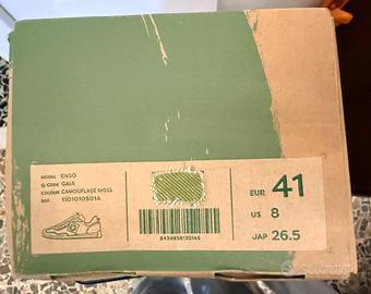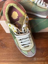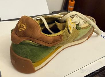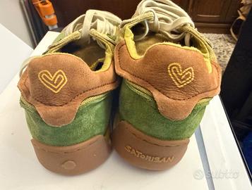 Sneakers Satorisan modello Ensò, realizzate in pelle e tessuto. Misura 41. Design unico con combinazione di materiali. Dettagli in pelle marrone e tessuto verde. Suola in gomma, tomaie in cotone organico e materiali pregiati. Il tutto unito a una finitura rustica. Grande qualità e grande confort