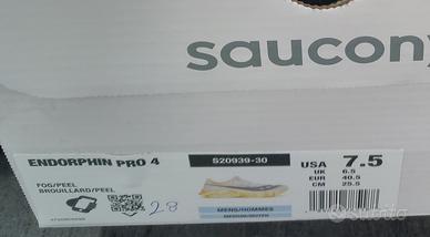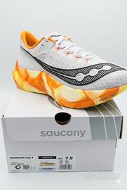 Saucony endorphin pro 4 running - taglia 40,5 La tomaia delle Endorphin Pro 4. intersuola, realizzata in doppia mescola PWRRUN PB e PWRRUN HG, assicura un'elasticità straordinaria e una propulsione senza eguali, mentre il sistema SPEEDROLL ti regalerà transizioni efficaci durante la fase di slancio. La piastra in fibra di carbonio a tutta lunghezza dona un plus di propulsione che farà la differenza sia durante gli allenamenti veloci che nei momenti decisivi della gara. Infine, la suola realizzata in gomma XT-900 e posizionata nei punti di maggior usura, combina al meglio durabilità e trazione, rendendole perfette per un uso prolungato.