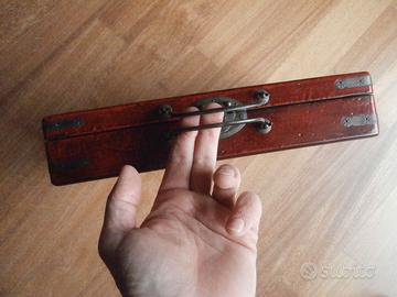 Scacchiera in stile etnico cinese, contenuta in una scatola di legno finemente decorata. Il piano di giuoco è pieghevole e si ripone dentro la scatola dove sono contenuti i pezzi da gioco, rendendo il tutto facilmente trasportabile e riponibile. Misure: 33x18x6 cm. In perfette condizioni.
