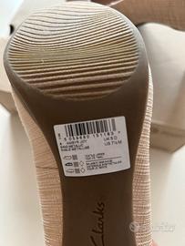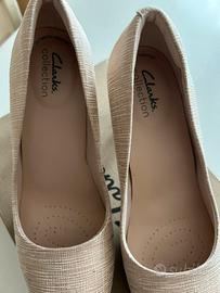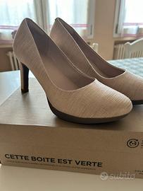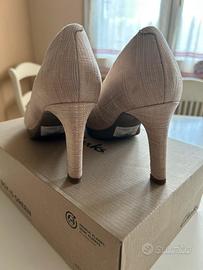 Scarpa rivestimento in tessuto colore beige tendente al rosa antico con un leggero filo dorato. Indossate solo una volta. Suola in gomma antiscivolo. Misure tacco in foto