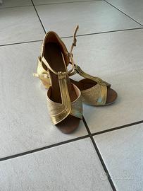 Vendo splendide scarpe tecniche per danza sportiva (latino-americano, caraibici, ballo da sala) per bambina o ragazza. Modello interamente color oro specchiato con bellissimi brillantini glitter sulla parte anteriore e sul tacco.