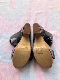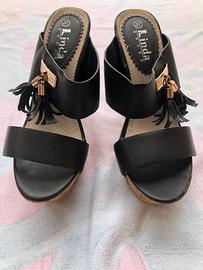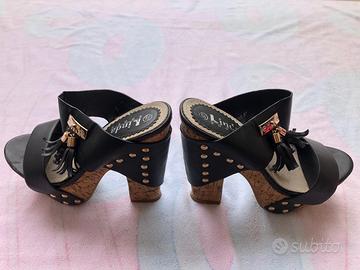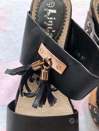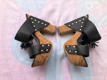 Zeppa in ecopelle di 14 cm, nr. 37 con plateau e tacco largo in sughero con borchiette dorate e doppio ciondolo sull'esterno. Vendo causa acquisto errato numero Usate 2 volte (come si vede dalle suole) -spedizione in 24h-