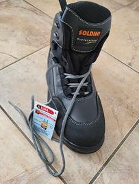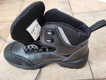 scarponcino di sicurezza, in pelle allacciatura mediante 5 coppie di passalacci in tessuto e 2 coppie di ganci sintetici, con tirante al tallone per agevolare la calzabilità
