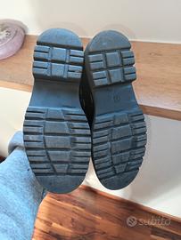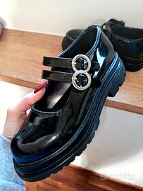 Scarpe nero vernice, con 2 laccetti regolabili sulla caviglia. Taglia 32