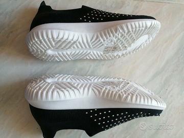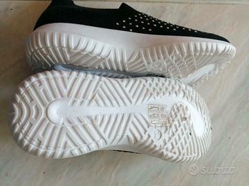 Scarpa da bambina di colore nero e con il fondo bianco, arricchita con strass molto comoda, facile e veloce da indossare, poiché senza lacci, numero 34. marca 10 baci, comprata da Pittarosso. Nuova mai indossata, senza scatola.