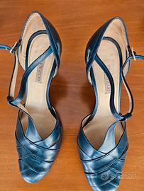 Scarpa in pelle blu navy con cinturino a T e tacco di 8 cm in ottimo stato, messe poche volte. Suola in cuoio e tacco perfetto. Marca Vergelio (Milano) Taglia 37 e mezzo ma va bene a chi ha generalmente il 37.