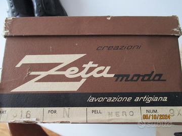 Scarpa classica vintage, creazioni Zeta Moda, lavorazione artigianale, vera pelle, colore nero, suola cuoio. Leggermente scucite su tallone dx. Numero 9 ½ – 43. Usate