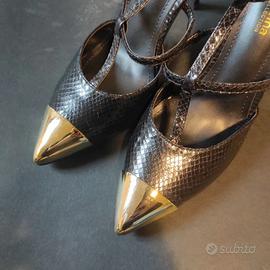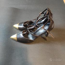 Décolleté nero in finta pelle ricamata a squame, con punta dorata, tacco 10