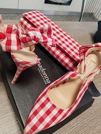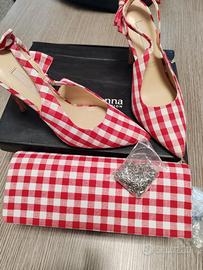 Scarpa decolleté con tacco 5, colore bianco e rosso , con fiocchetto dietro ,facile da indossare con fascetta elastica . Pochette con catenella stesso colore. Vendo per non utilizzo . Niente spedizioni . Consegna e ritiro previo accordo . Pagamento contanti.