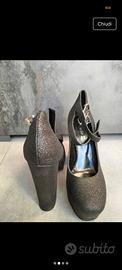 Scarpa nera con glitter argento, tacco 12cm con plateau, doppio cinturino sulla caviglia per ottima stabilità