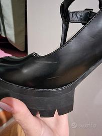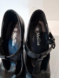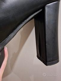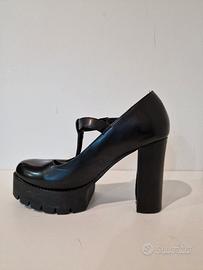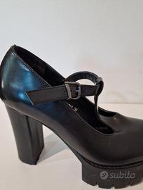Scarpe con tacco 11 chiusa, con laccetto frontale. Colore nero. Utilizzate e con qualche imperfezione, ma in buone condizioni. Taglia 38.