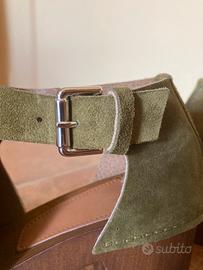 Scarpa con tacco alto cm. 7, numero 39, calzata regolare, colore verde scuro/cachi, scamosciata, di marca, con fibbia laterale color argento, gomma antiscivolo, cavigliera frangiata removibile. Indossata due volte.