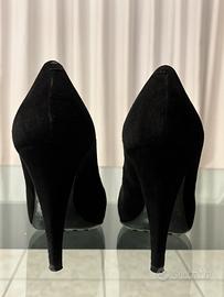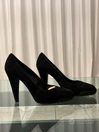 Questa raffinata calzatura firmata Tod's incarna l'essenza dell'eleganza senza tempo, fondendo la maestria artigianale italiana con un design contemporaneo e sofisticato. Realizzate in una pregiata pelle scamosciata dalla tonalità nero profondo, queste décolleté si distinguono per la silhouette slanciata e la cura meticolosa dei dettagli. La struttura è caratterizzata da un tacco a stiletto bilanciato da un discreto plateau anteriore, studiato per conferire slancio alla figura garantendo al contempo una calzata confortevole e sicura. Dettagli Distintivi • Materiale: Camoscio di altissima qualità, dalla texture vellutata e uniforme. • Suola Iconica: Il fondo presenta i caratteristici gommini in rilievo, firma inconfondibile del brand, che assicurano una perfetta aderenza e un tocco di stile iconico. • Design: Scollatura classica che valorizza la forma del piede, ideale per occasioni formali o per elevare un outfit da sera. • Corredo: L'articolo è presentato nella sua scatola originale ocra con logo a contrasto, completa di documentazione di autenticità. Queste calzature rappresentano un investimento di stile per la donna che ricerca un accessorio sobrio ma di grande impatto, capace di resistere al passaggio delle mode grazie alla nobiltà dei materiali e alla pulizia delle linee.