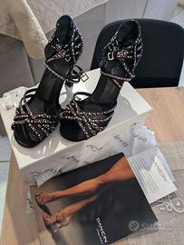 Vendo bellissime scarpe marca "Dancin" taglia 37. Modello limited edition in raso nero con listini incrociati, Crystal strass rosa e boreali, tacco 8 cm. Prezzo di listino 154,00€ Scarpa acquistata nel maggio 2019, usate per pochi mesi e poi riposte. La scarpa si presenta come nuova e con brillantini di ricambio. prezzo trattabile