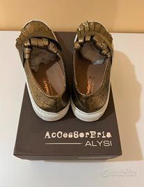 Vendo Scarpa da Donna Marca: Alysi Numero: 37 Colore: d’orato e pianta bianca Condizioni ottime e con scatola