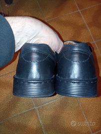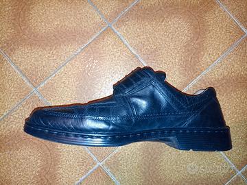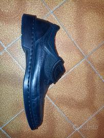 Vendo scarpa in pelle nera con chiusura in velcro tenuta discretamente bene. Comoda scarpa per piedi a pianta larga. Scambio a. mano zona Mestre e limitrofi. Non spedisco.