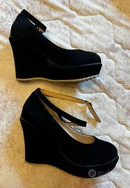 Scarpa elegante nera scamosciata con zeppa e laccio alla caviglia.