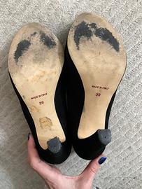 Décolleté spuntate nere, scamosciate, con tacco 12 cm e plateu 2 cm. Numero 39. usurate come si vede in foto. I tacchi sono in buono stato.
