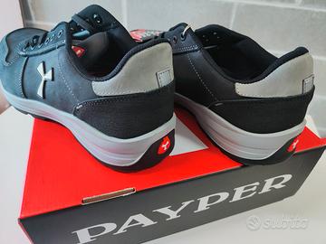 Scarpa di sicurezza antistatica bassa da uomo, tomaia in pelle idrorepellente e traspirante, fodera interna (per tutta la superficie interna) traspirante e resistente all'abrasione, 6+6 occhielli metalfree, paratacco in grana pampas con inserto riflettente, puntale in alluminio pressofuso, plantare estraibile Ortholite X40 016, soletta in lamina tessile certificata antiperforazione, cambrione anti-torsione, sottopuntale a ferro di cavallo, intersuola in poliuretano ultraleggero, ammortizzatore MASTER BALANCE in PU polietere ad alta tenacità e densità bilanciata, suola XTRAIL GRIP in TPU con paratacco e parapunta.Scarpa di sicurezza Payper Get force low SE - Tg 46