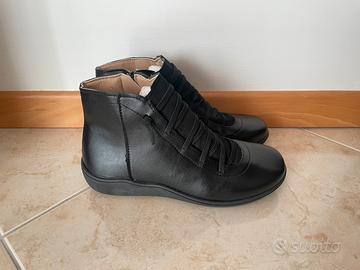 Scarpa nera per donna, in ecopelle, con cerniera nella parte interna della caviglia, pianta larga, suola da città.