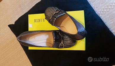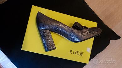 Scarpa donna modello mocassino, con frangia e fibbia in metallo, colore nero piombo, tacco 80 squadrato. Numero 39. Made in Italy. Brand "Il Laccio".