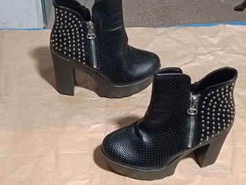 Scarpa da donna, nera, con borchie argentate, apertura tramite cerniere laterali, misura 38, zeppa da 5 e tacco da 13.