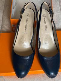 Scarpa da donna Valleverde. Slingback in pelle blu, modello Alice 55 F, lavorazione flexible, morbida tomaia in pelle, cinturino regolabile, sottopiede in pelle sagomato per una camminata più confortevole, suola in puro cuoio con logo, altezza tacco 6 cm. Made in Italy. Utilizzata una sola volta (misura errata). Veste regolare. N. 38.