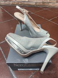 Scarpa Nero Giardini estiva,taglia 37.Aoerta davanti e dietro,ha una leggera zeppa Tacco sottile Colore argento con brillantini e sfumatura rosa antico.Usate una sola volta ,non hanno difetti.
