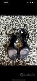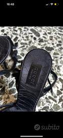 Scarpa Gucci Sandalo con tacco. Taglia 38.5 In pelle rivestito in raso. Cinturino con fiocchetto e pendente gucci.