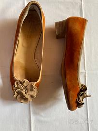 Scarpa dal gusto retrò e romantico, in camoscio arancio caldo, decorata con un grande fiore in pelle beige applicato sulla punta.