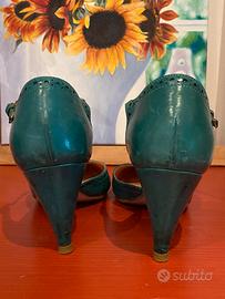 Scarpe vero cuoio con piccola fibbia laterale color petrolio, tacco centimetri 8 usata ma ancora portabilissima, con qualche traccia di usura visibile in foto.senza scatola