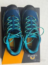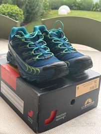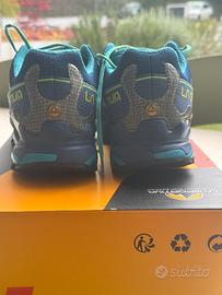 Vendo scarpe da trail running originali La Sportiva Ultra Raptor GTX, taglia EU 42 (UK 8), colore Indigo/Apple Green. Condizioni eccellenti, praticamente come nuove: indossate pochissime volte, suola con tasselli integri, tomaia pulita e priva di segni di usura significativi. Scatola originale inclusa. Caratteristiche tecniche: •Membrana Gore-Tex per impermeabilità e traspirabilità garantite •Suola FriXion XF con tecnologia Impact Brake System per massima trazione e frenata sicura su terreni ripidi e scivolosi •Protezione anteriore rinforzata (toe cap) •Soletta Ortholite per ammortizzazione e comfort prolungato •Tomaia in mesh tecnico con overlay in TPU per supporto e durata •Peso contenuto per una scarpa da trail con protezioni complete